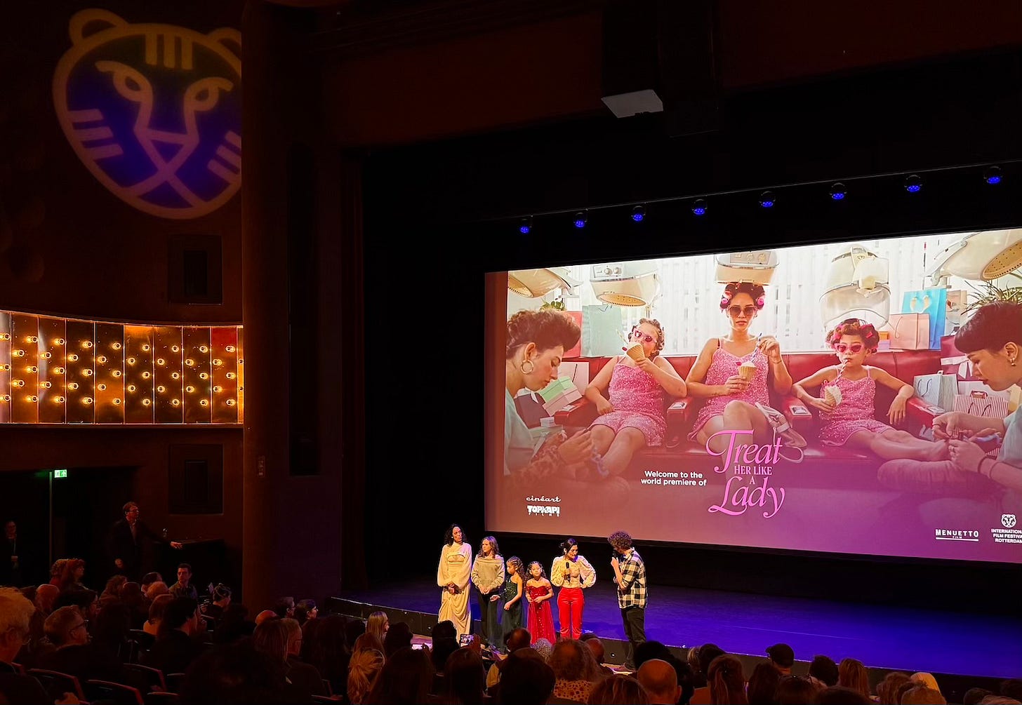 Op de foto zie je links actrice Nienke Plas met haar medespeelsters en in rode broek regisseuse Paloma Aguilera Valdebenito bij de wereldpremière van Treat Her Like a Lady. Dat is een vrolijke, anarchistische familiefilm over een bijstandsmoeder en haar gezinnetje die ernstig in de problemen raken. Ze worden geconfronteerd met strafmaatregel op strafmaatregel, hun huis uitgezet en meer onvoorstelbare ellende maar de moeder, een rol waar Nienke Plas in schittert, slaat zich overal doorheen. De regisseuse vertelde na afloop dat ze ervaringsdeskundige is op dit gebied en graag de kracht wilde laten zien van mensen uit volkswijken, in plaats van hen als slachtoffer neer te zetten. Dat doet ze ze sprankelend.